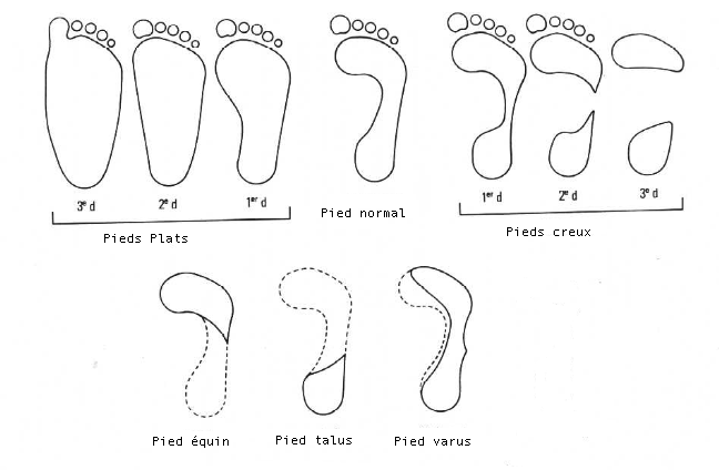Schématiquement il est possible de classer différents types de pieds selon leurs formes. L'étude doit se faire sur les 3 plans, horizontal, frontal et sagittal, en statique puis en dynamique afin d'en disséquer toutes les composantes.